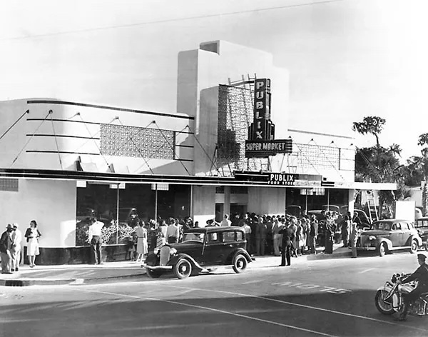 Publix Super Market grand opening circa 1940s Florida, crowd gathered outside George Jenkins' original food palace storefront